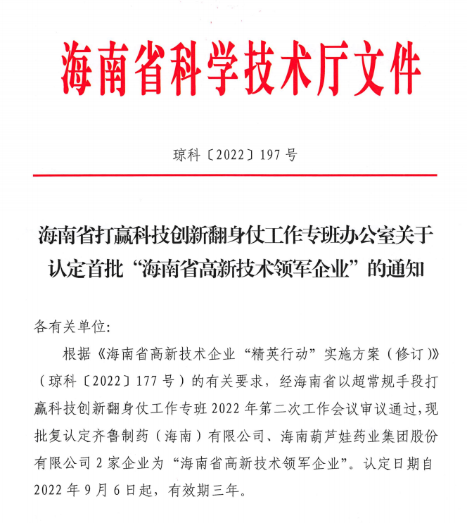 近日,海南省科学技术厅发布的《海南省打赢科技创新翻身仗工作专班办公室关于认定首批“海南省高新技术领军企业”的通知》中显示,批复认定海南BG视讯药业集团股份有限公司等2家企业为“海南省高新技术领军企业”。认定日期自2022年9月6日起,有效期三年。